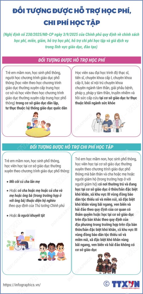 Ngày 3/9/2025, Chính phủ ban hành Nghị định số 238/2025/NĐ-CP quy định về chính sách học phí, miễn, giảm, hỗ trợ học phí, hỗ trợ chi phí học tập và giá dịch vụ trong lĩnh vực giáo dục, đào tạo. Nghị định nêu rõ những nhóm đối tượng thuộc cơ sở giáo dục dân lập, tư thục được hỗ trợ học phí cũng như những nhóm đối tượng có hoàn cảnh đặc biệt được hỗ trợ chi phí học tập.