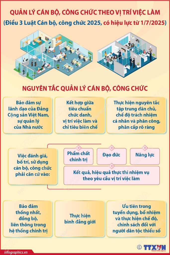 (TTXVN 11/7) Luật Cán bộ, công chức số 80/2025/QH15 của Quốc hội được thông qua ngày 25/6/2025 và chính thức có hiệu lực từ 1/7/2025. Tại Điều 3 Luật Cán bộ, công chức 2025 quy định nguyên tắc quản lý cán bộ, công chức: Bảo đảm sự lãnh đạo của Đảng Cộng sản Việt Nam, sự quản lý của Nhà nước; kết hợp giữa tiêu chuẩn chức danh, vị trí việc làm và chỉ tiêu biên chế; thực hiện nguyên tắc tập trung dân chủ, chế độ trách nhiệm cá nhân và phân công, phân cấp rõ ràng; việc đánh giá, bố trí, sử dụng cán bộ, công chức phải căn cứ vào phẩm chất chính trị, đạo đức, năng lực và kết quả, hiệu quả thực thi nhiệm vụ theo yêu cầu vị trí việc làm….